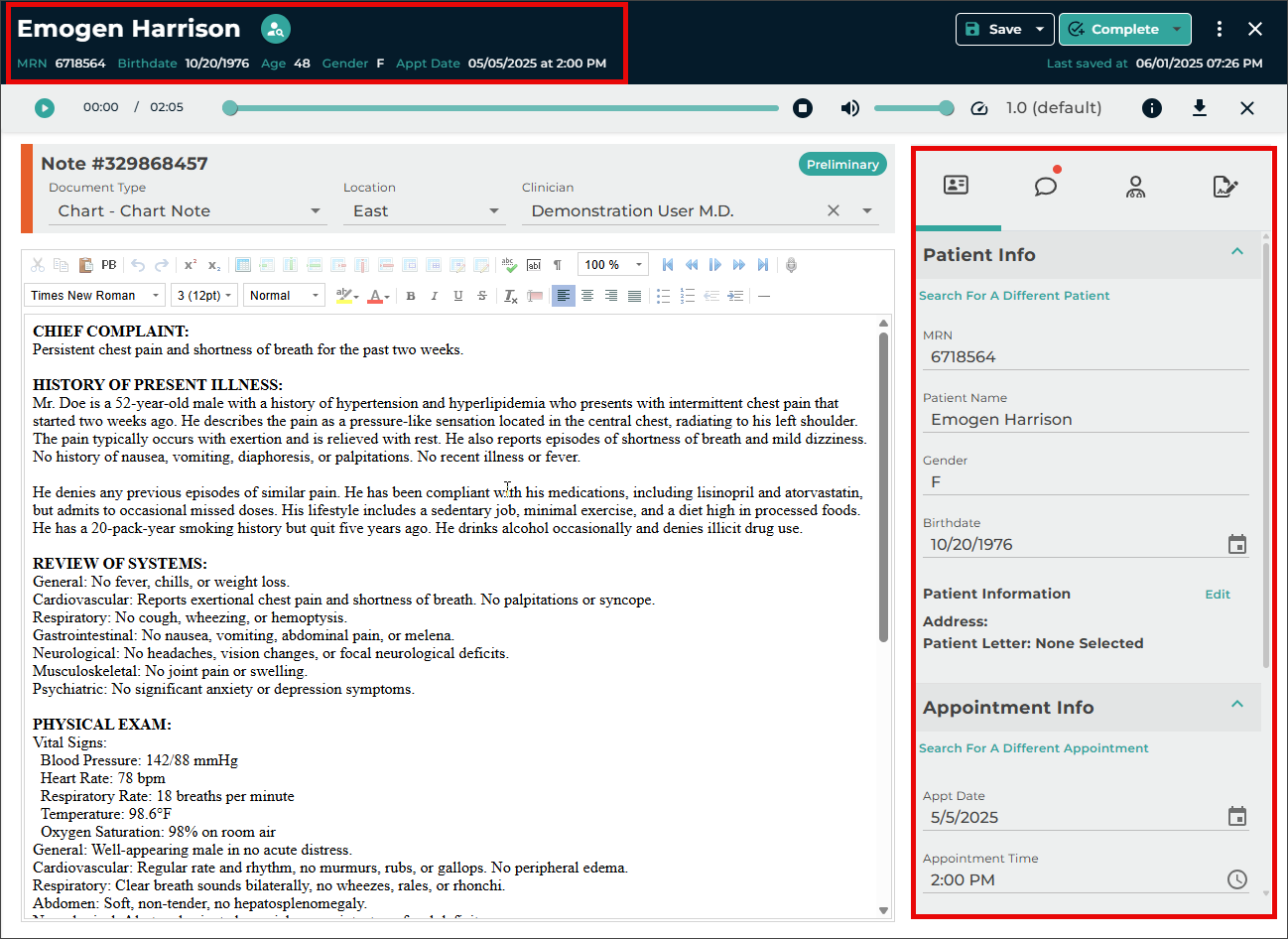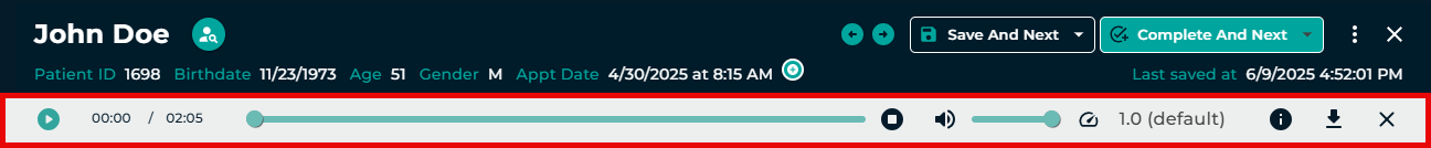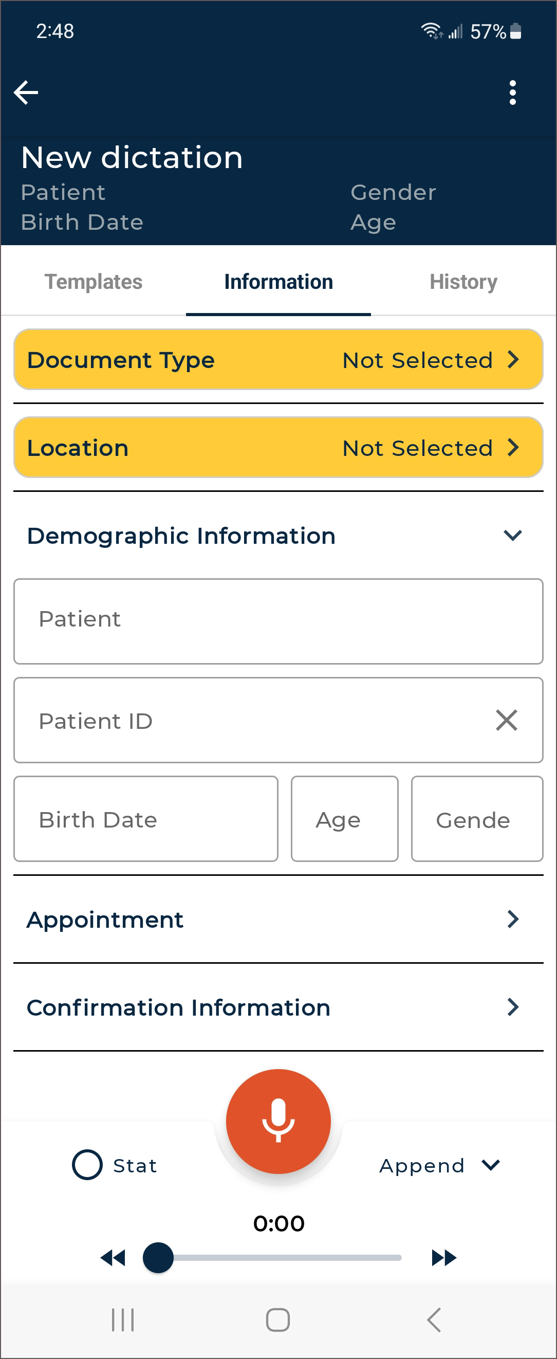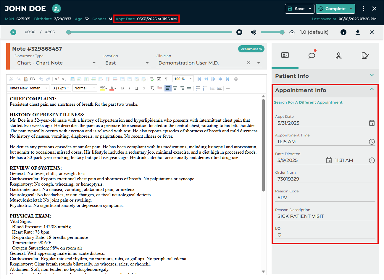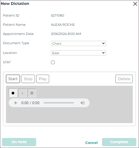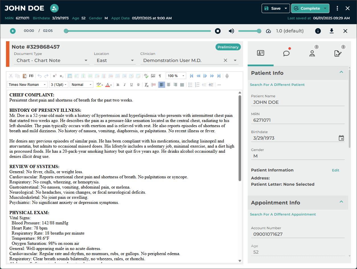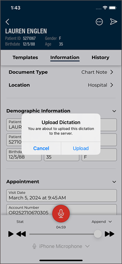 - Verify the correct Document Type and Dictator are selected in the demographics.
