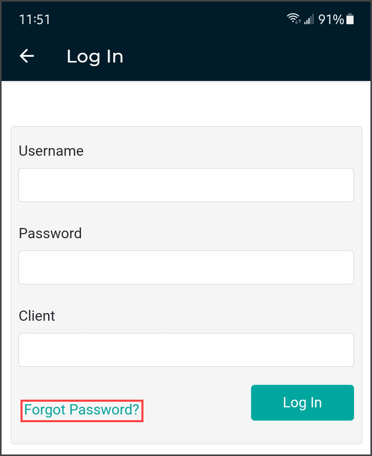 The 'Forgot Password?' link next to the Log In button allows users who have saved a valid email address to receive password reset instructions by email if it is lost or forgotten. For more information, go to Email Verification and Resetting Password.