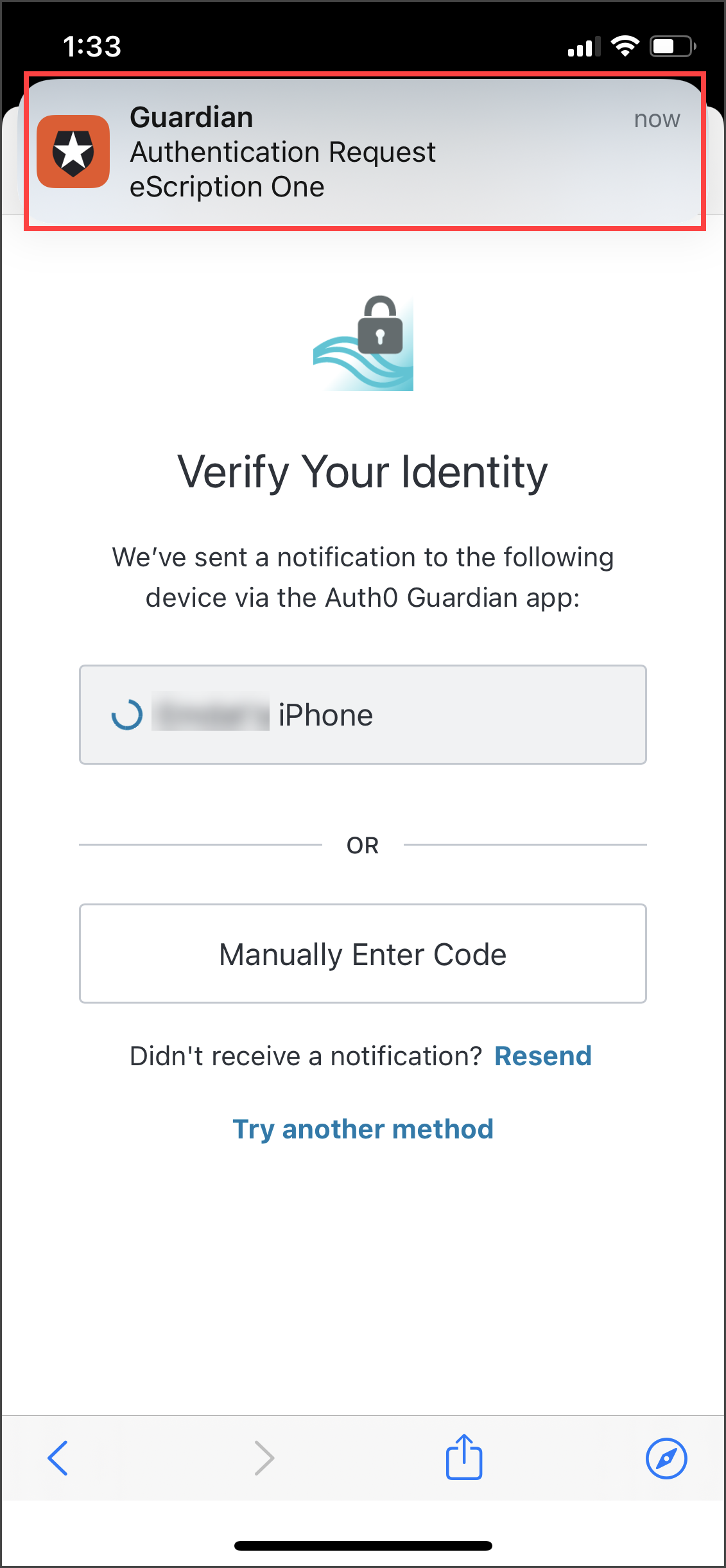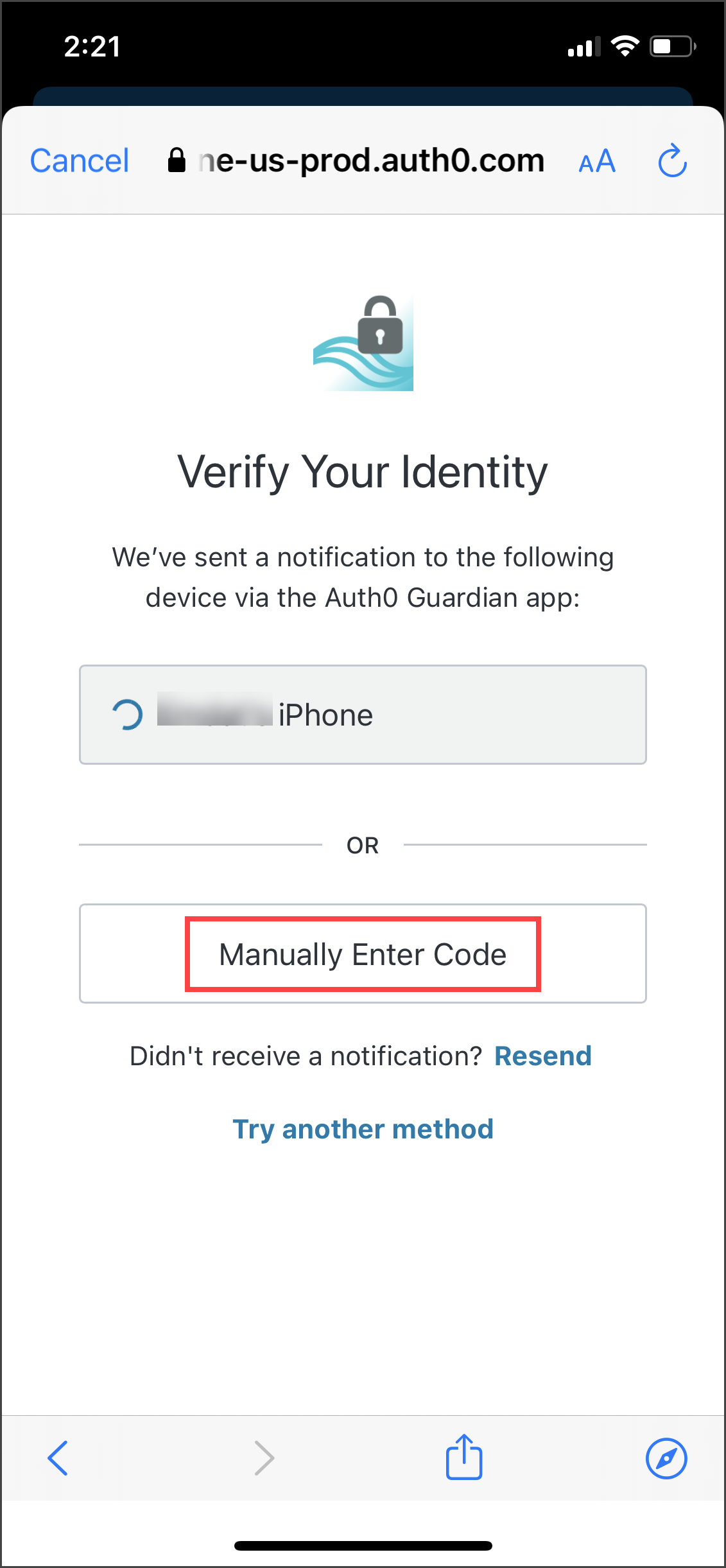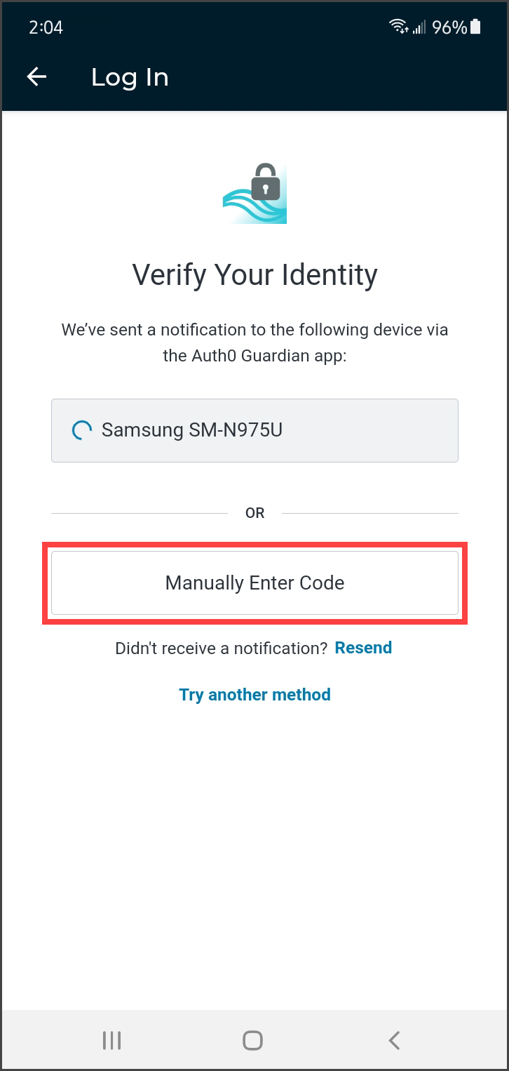 If you do not receive the notification, you can choose to have the notification resent, or you can manually enter the code by tapping Manually Enter Code on the 'Verify Your Identity' screen.