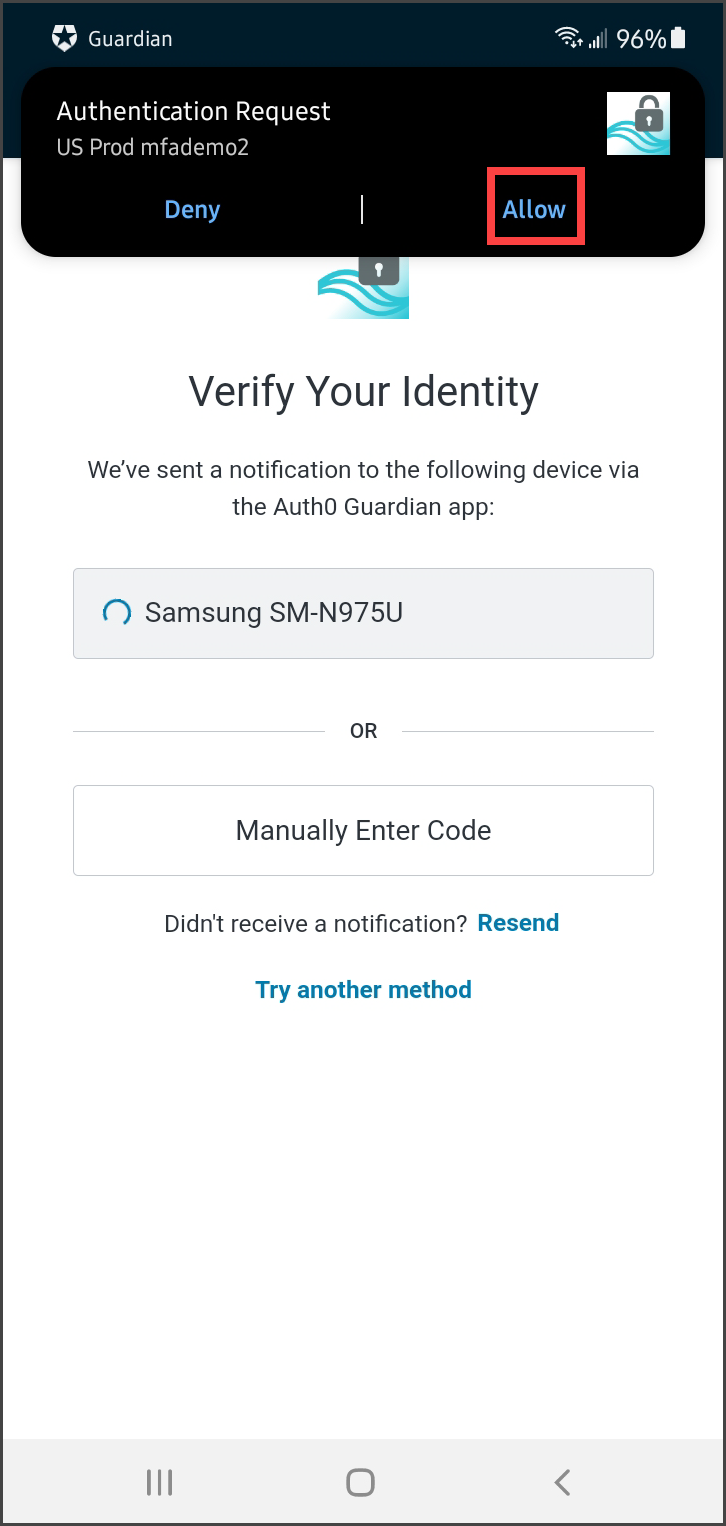 Depending on your device and Guardian app settings, you may receive a push notification for the authentication request. If so, tap Allow in the push notification.