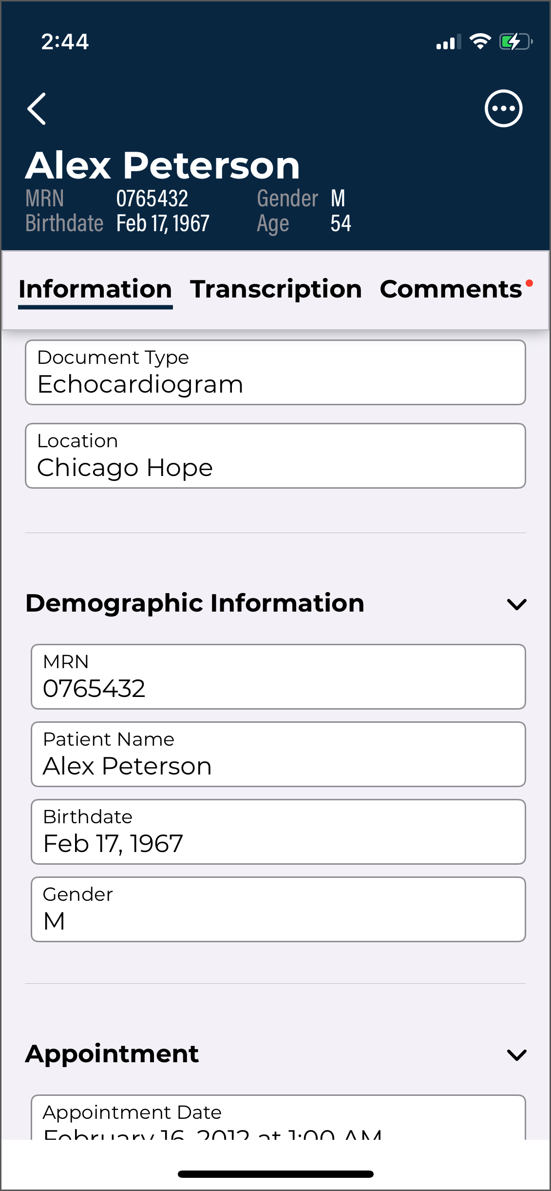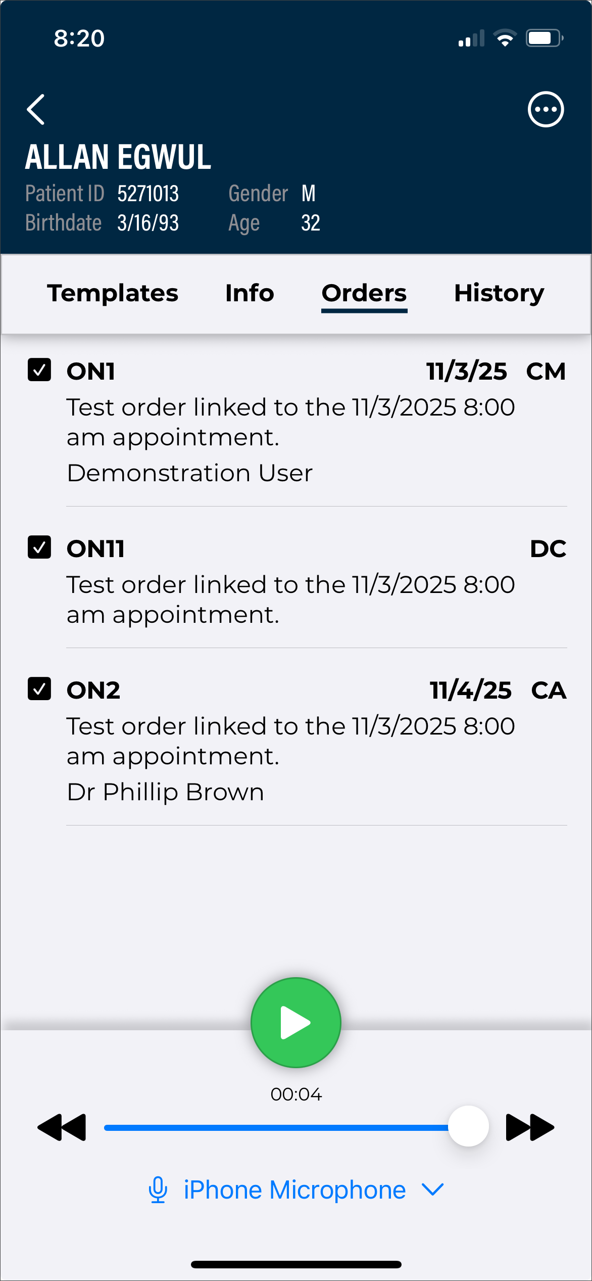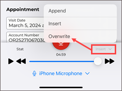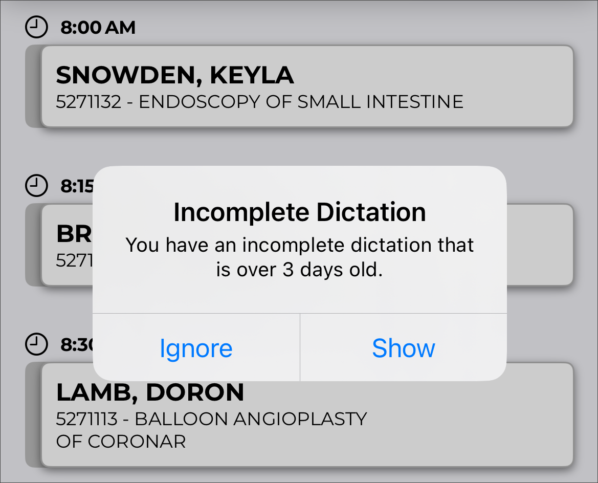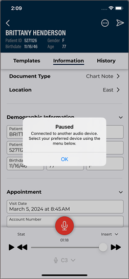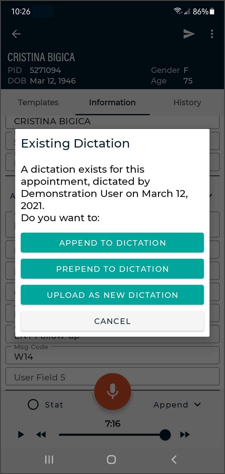 Dictation from another source - appointments with a dictation uploaded from a different mobile device or dictation source (InSync, InTouch, ShadowLink, etc.), or uploaded from this device but no longer stored on this device. Dictations uploaded from other devices or apps cannot be played from this device.