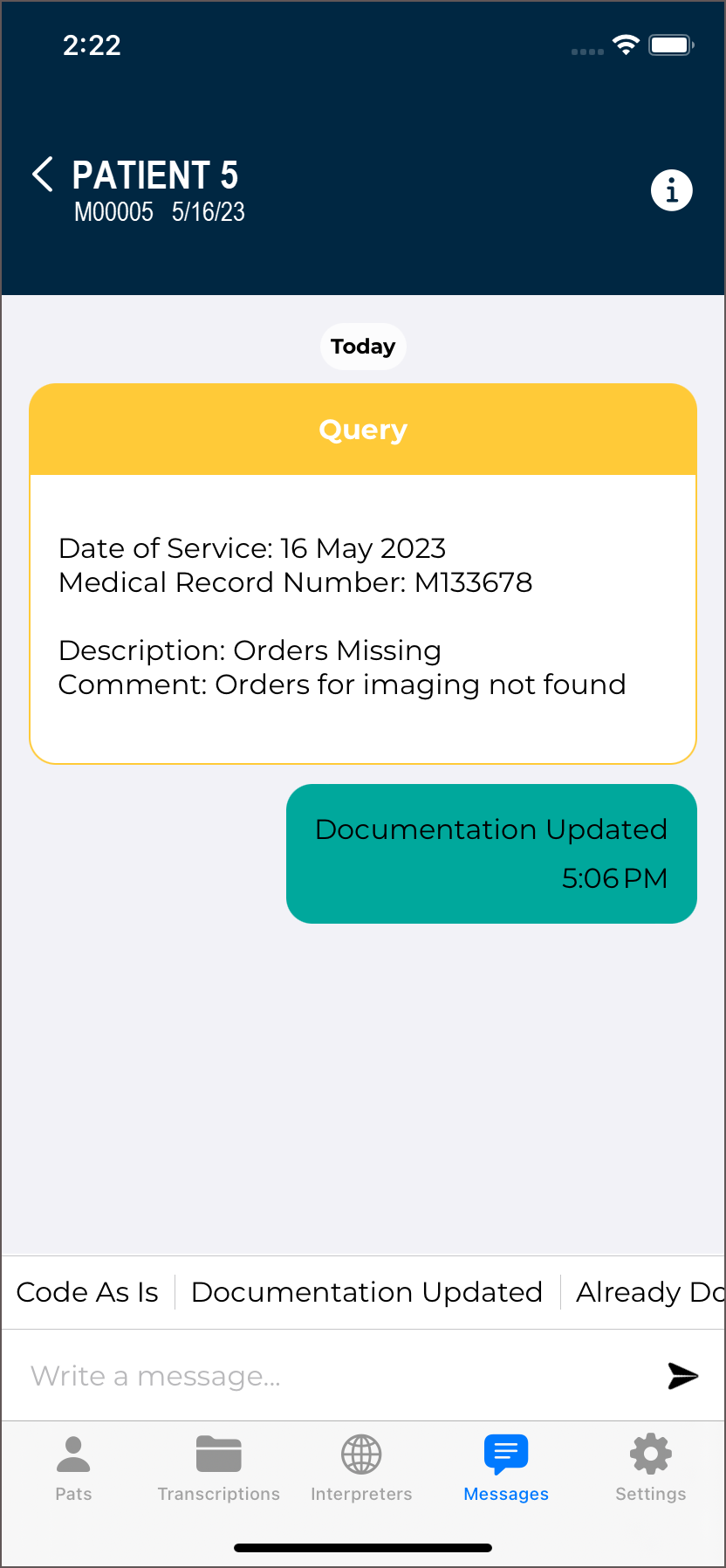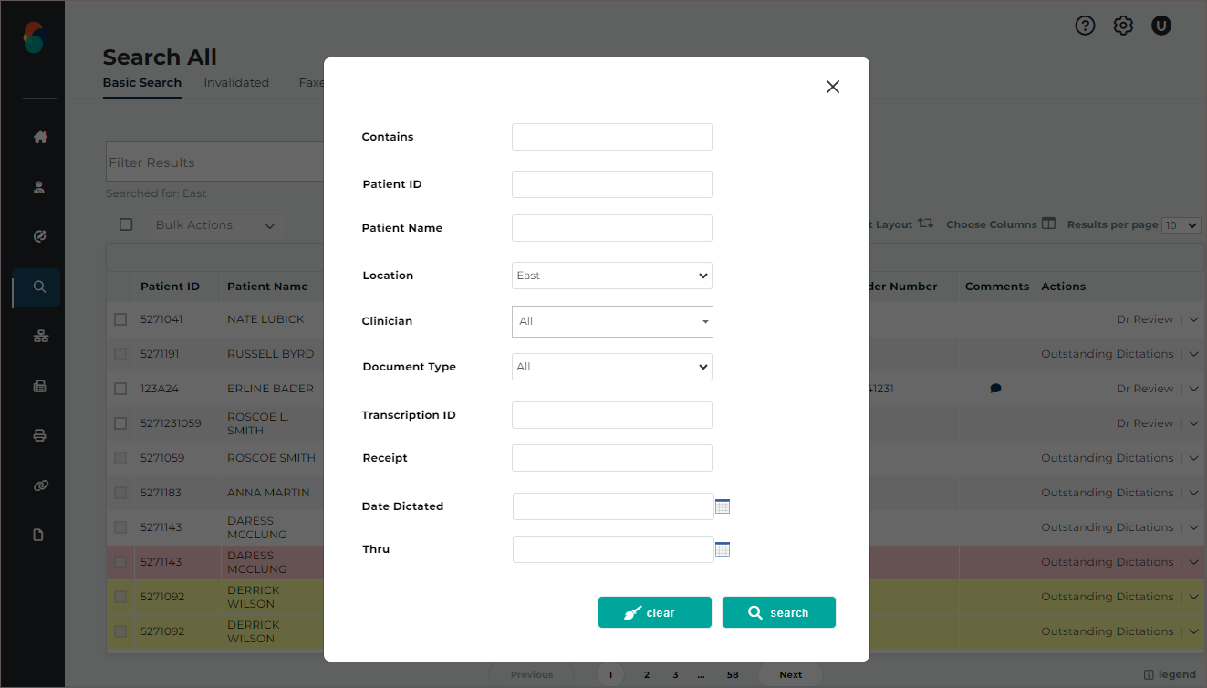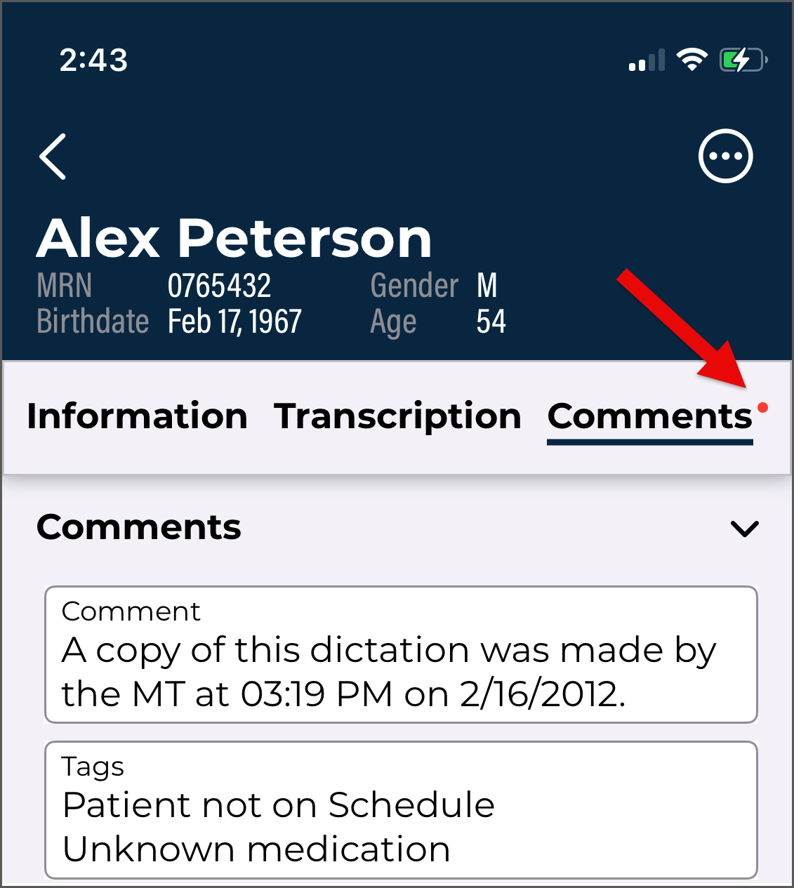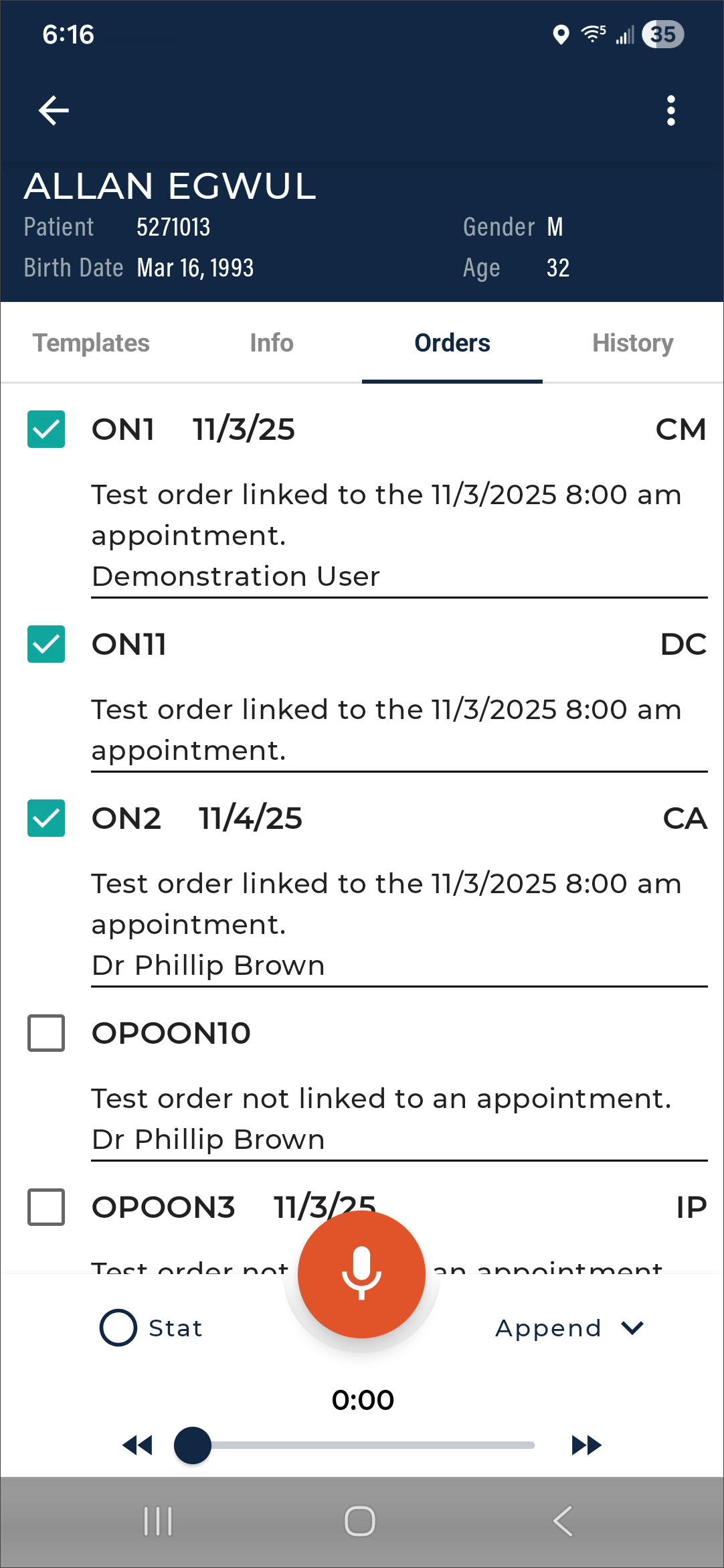 Use the Patients tab to view a list of patient appointments/encounters and create dictations.