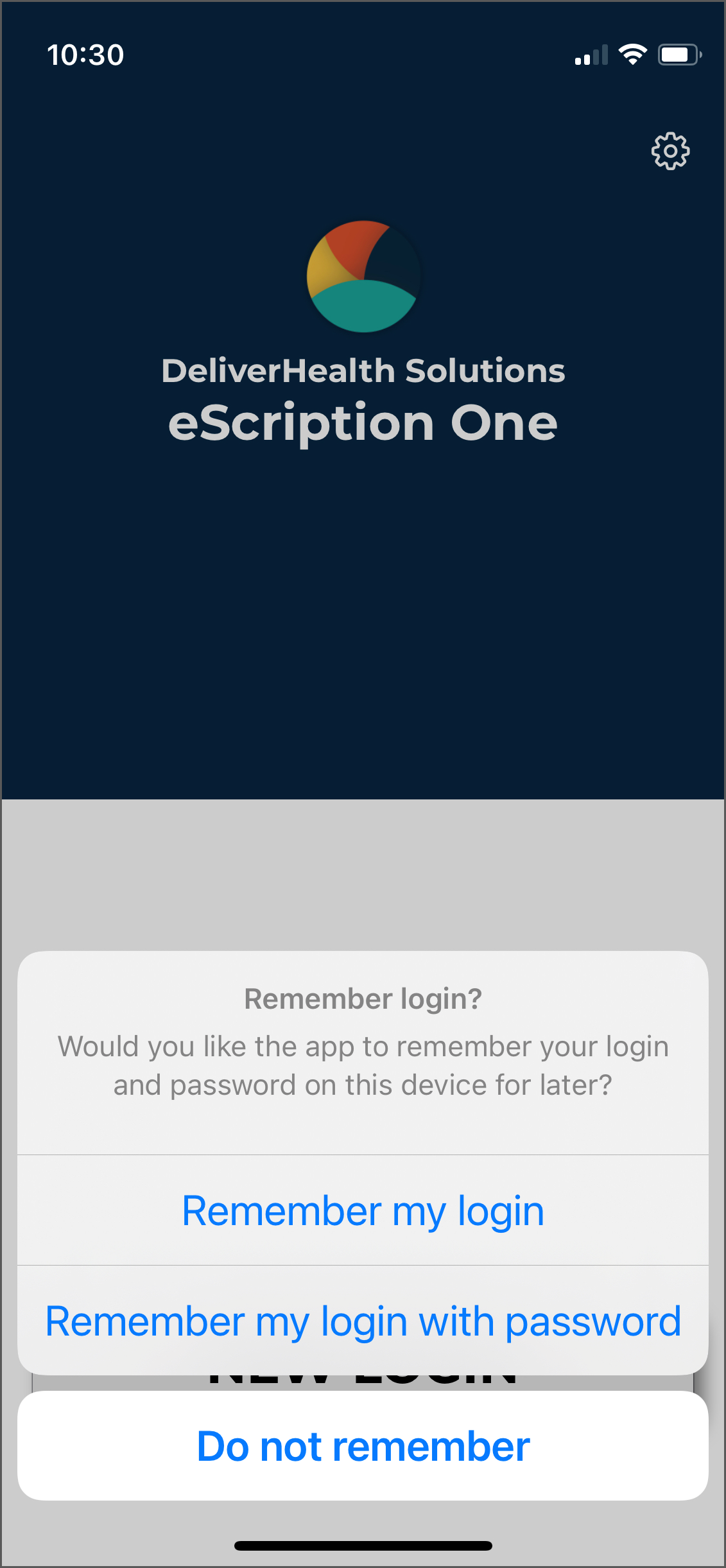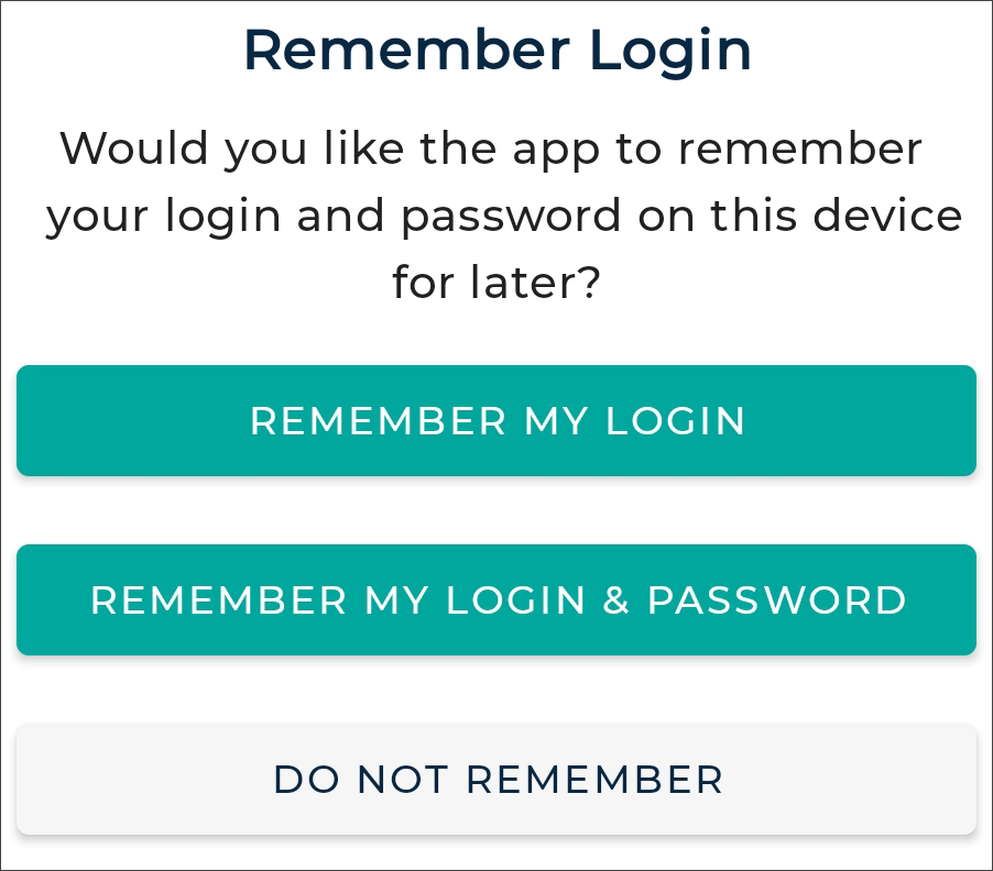 The first time a user logs in, the 'Remember Login' screen will appear next, asking if username and/or password should saved be on the device.