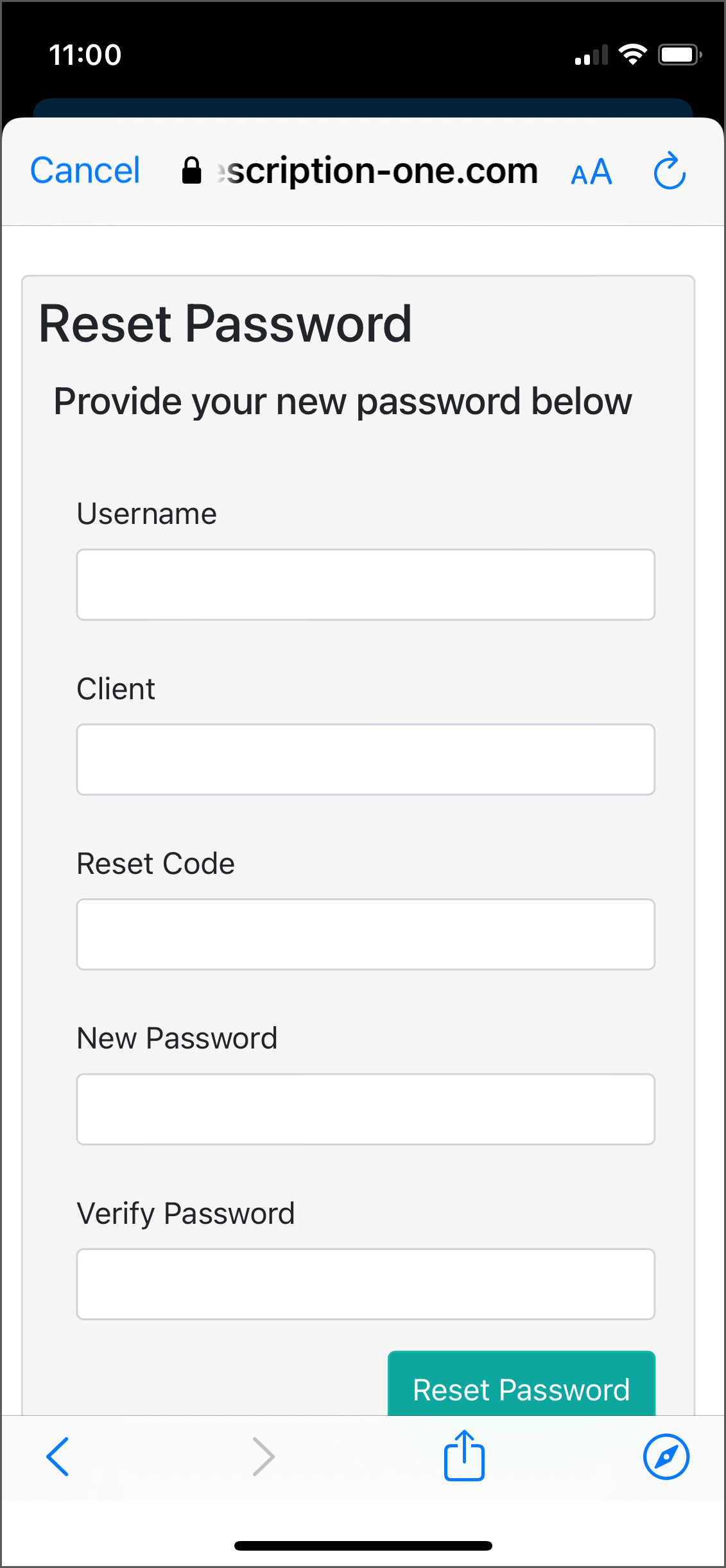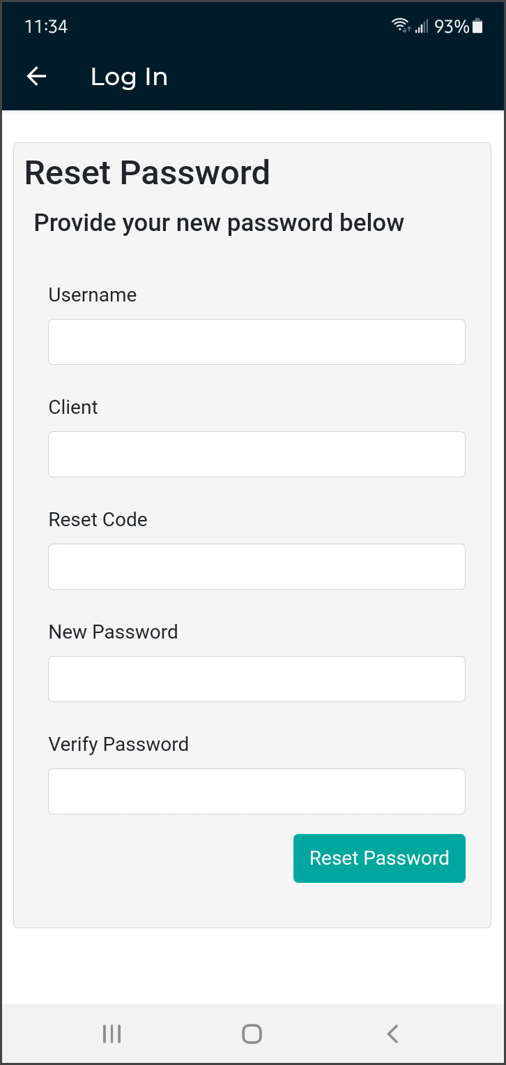 If you choose Have reset code?, the ‘Reset Password’ screen appears without the reset code filled in. Enter the code and remaining information, then click the Reset Password button.