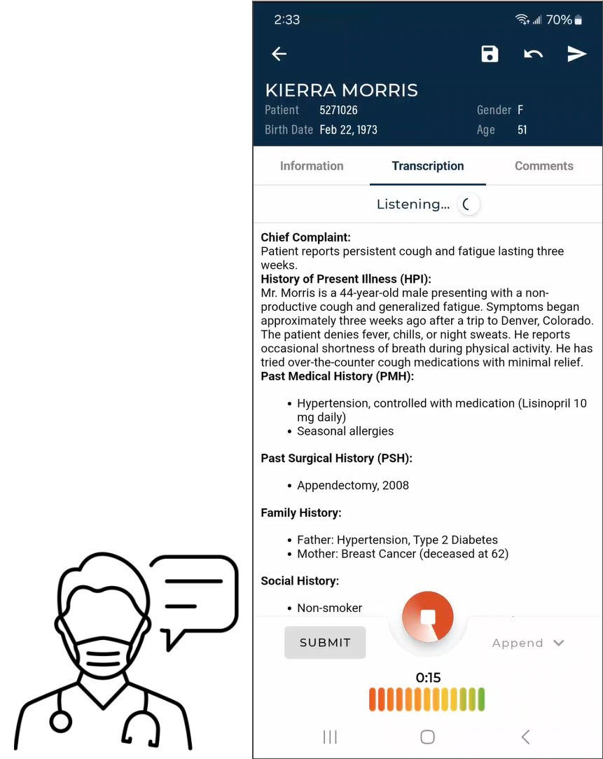 eSOne Mobile for Android offers a convenient, portable, end-to-end documentation process on any device running the Android operating system, such as tablets or phones. Clinicians can easily review, edit and complete documentation on their mobile device, as well as submit dictations for transcription. eSOne Mobile is a safe, secure application that supports HIPAA compliance.