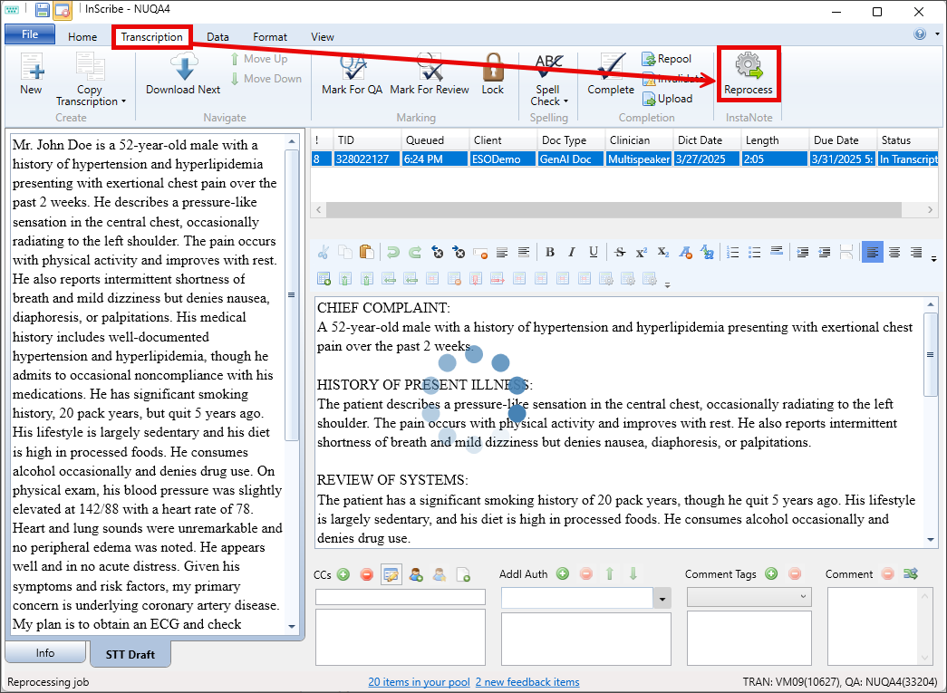 Reprocessing an InstaNote document in InScribe includes an additional enhancement not available in InQuiry. The speech-to-text (STT) draft can be edited to correct or add any parts of the dictation that were misinterpreted or omitted during the initial processing. With the updated STT draft, InstaNote will generate a more accurate and detailed note.