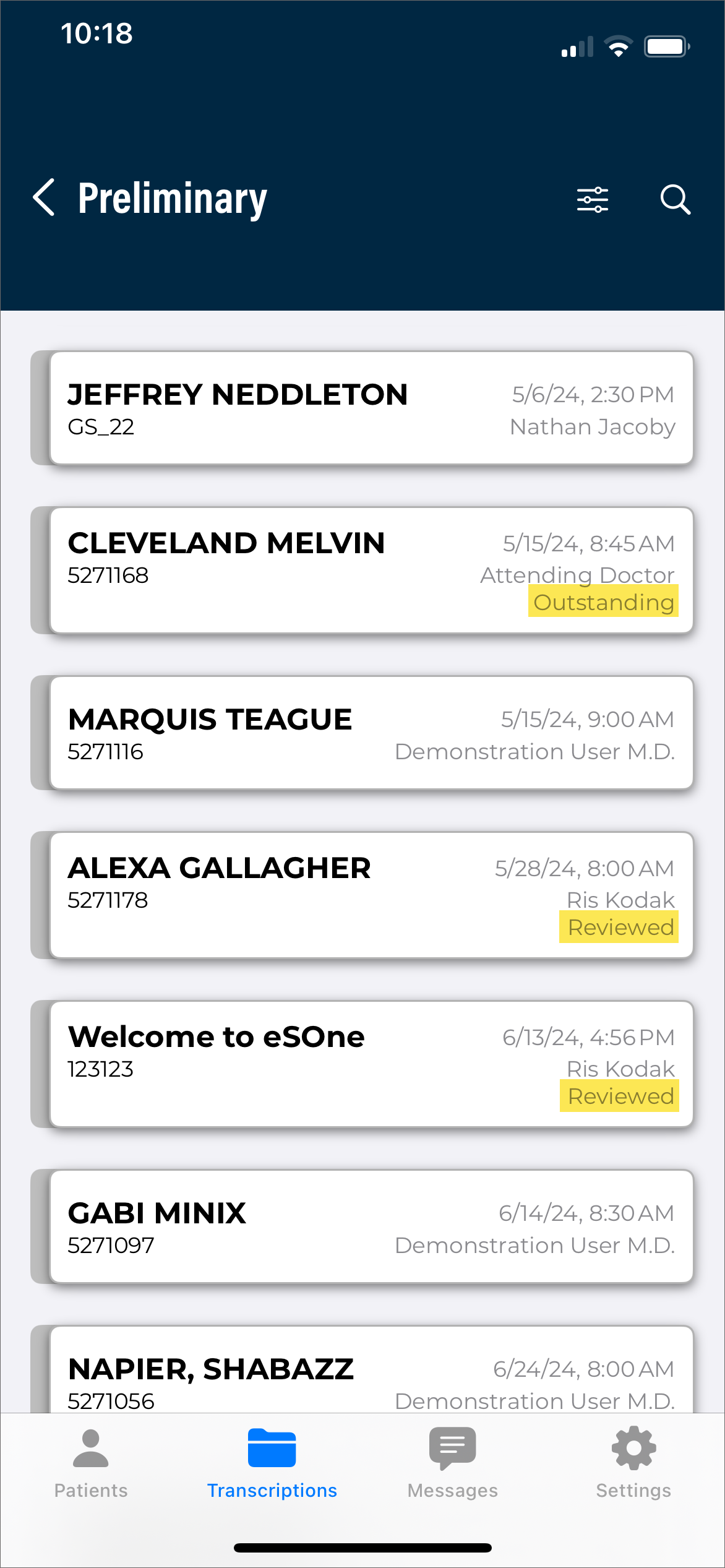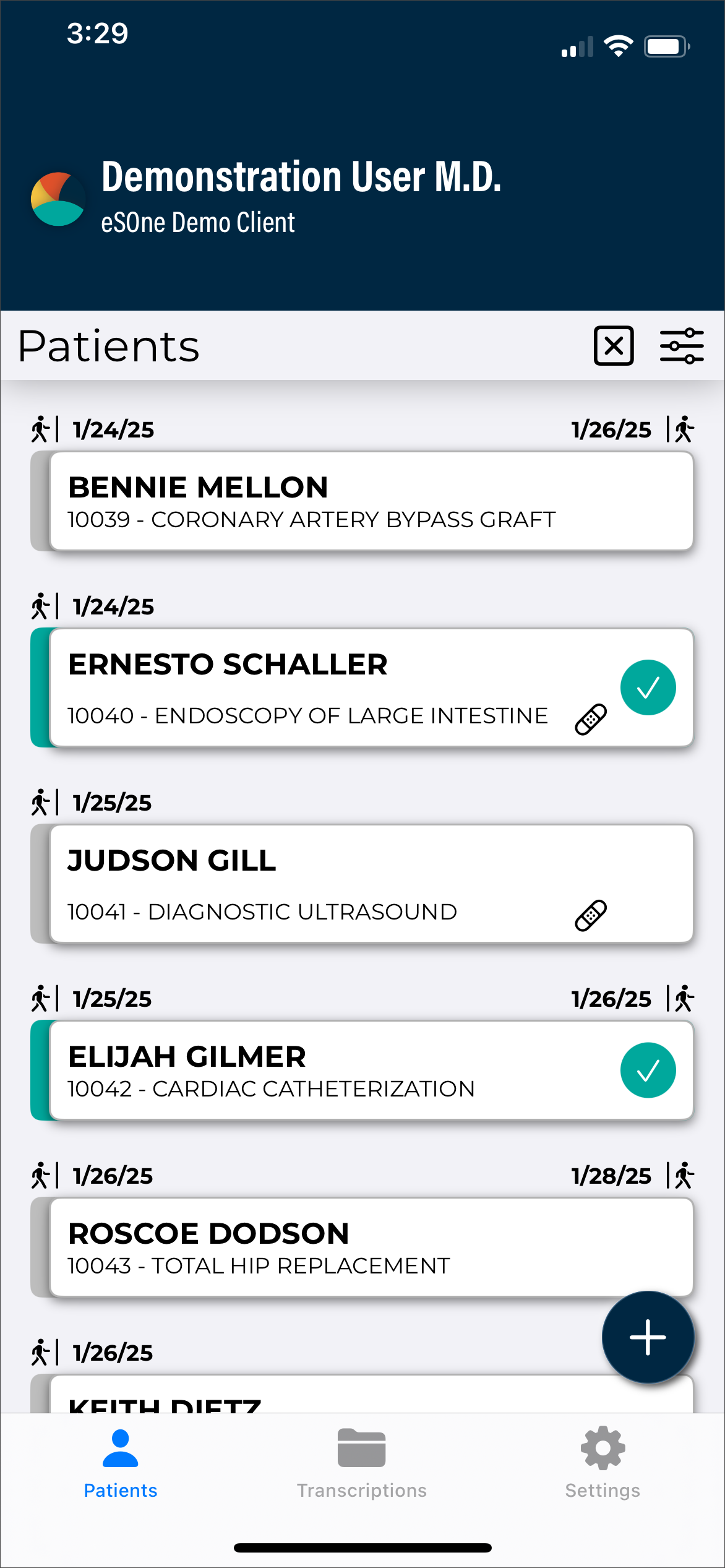 The eSOne Mobile application screens have three tabs at the bottom: Patients, Transcriptions, and Settings. Use these to navigate between the main screens of the app. The active tab is indicated with bold text and black-filled icons. The eSOne Mobile application displays the Patients tab after your initial login, or the last screen you visited in your previous session.