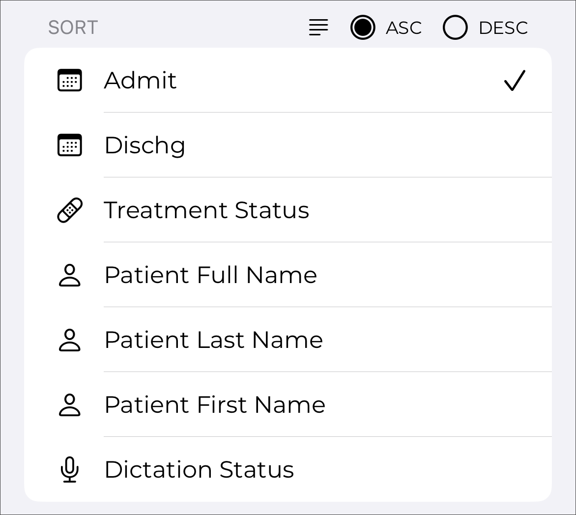 If the client supports both inpatient and outpatient workflows, users can switch between them by tapping the desired mode. For more information regarding the inpatient workflow within the mobile app, please see Inpatient Workflow. The following information in this section assumes an outpatient workflow is being used.