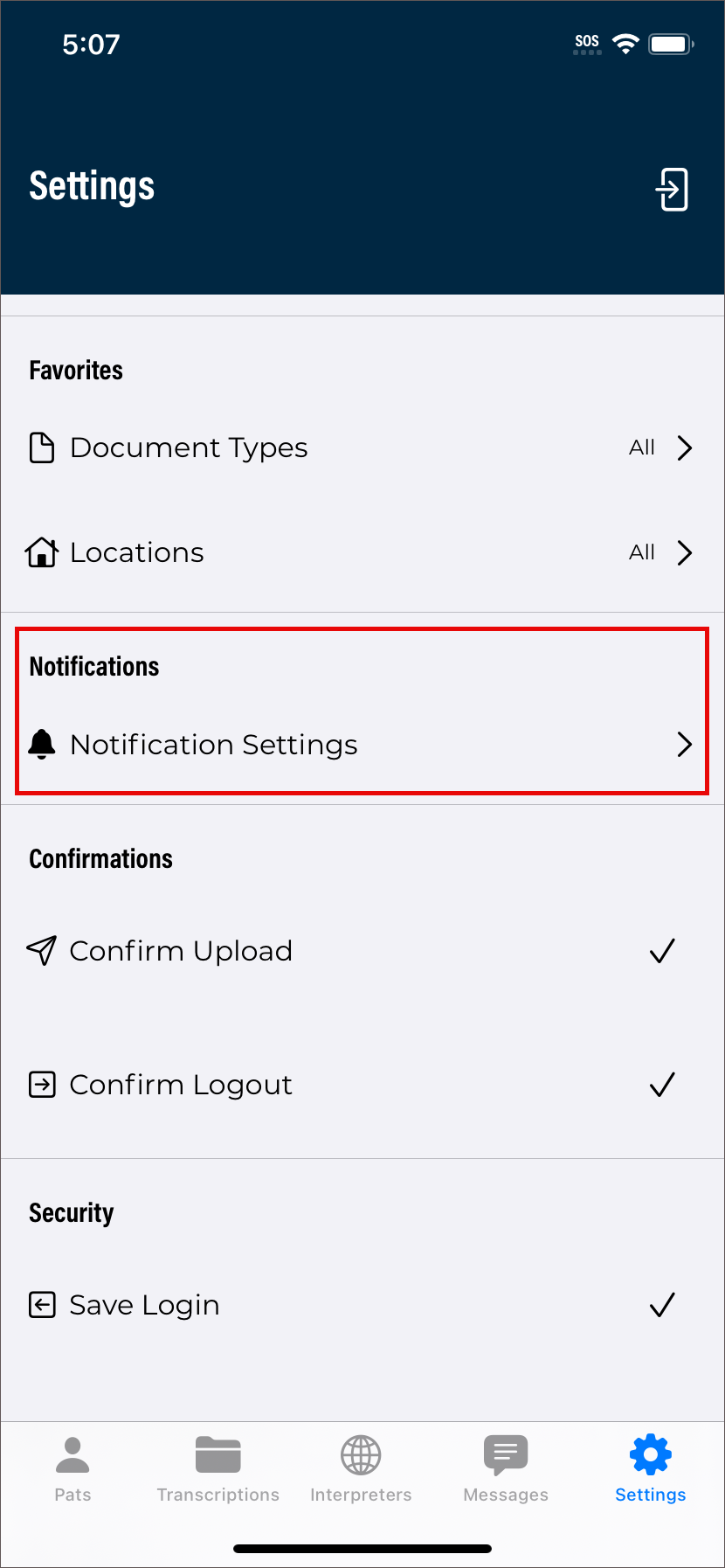 The Settings tab opens the Settings screen, where users can configure default settings for appointments, document types, locations, and other application features. Users can also add or switch to linked accounts from this tab, as well as log out of the mobile app.